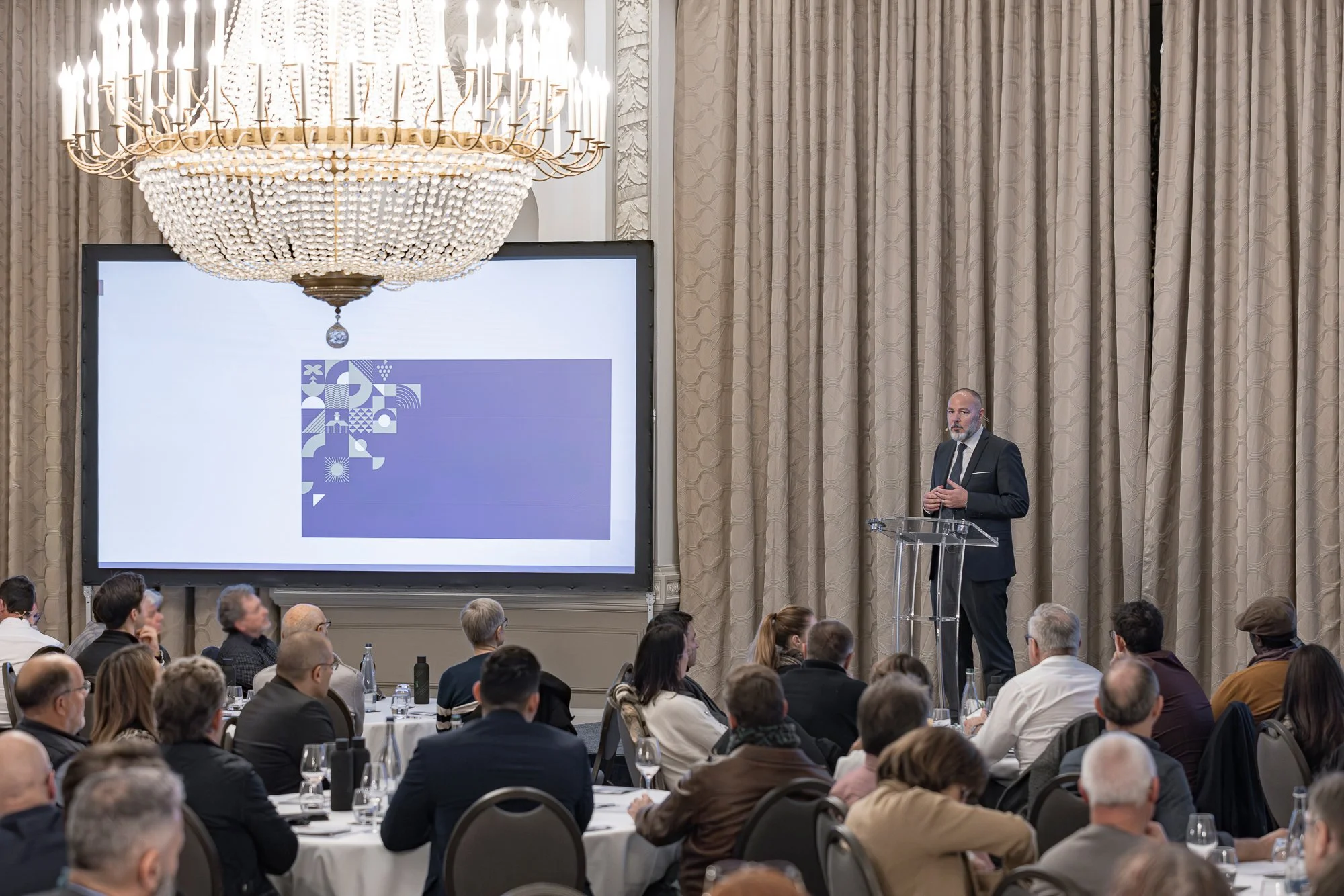 Un homme en costume sombre donnant une présentation sur scène devant un grand écran dans une salle de conférence avec un grand chandelier au plafond, un rideau beige en arrière-plan, et un public assis à des tables debout.