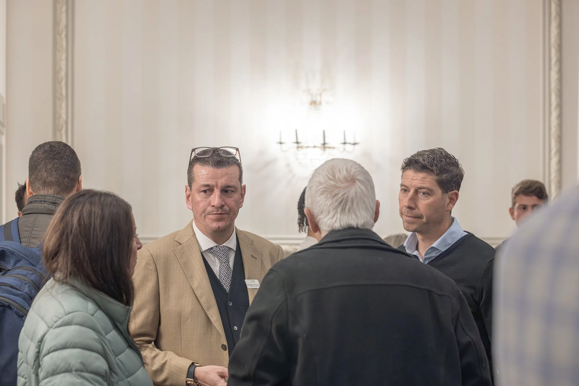 Groupe de personnes en conversation dans une salle élégante avec des murs ornés et un chandelier