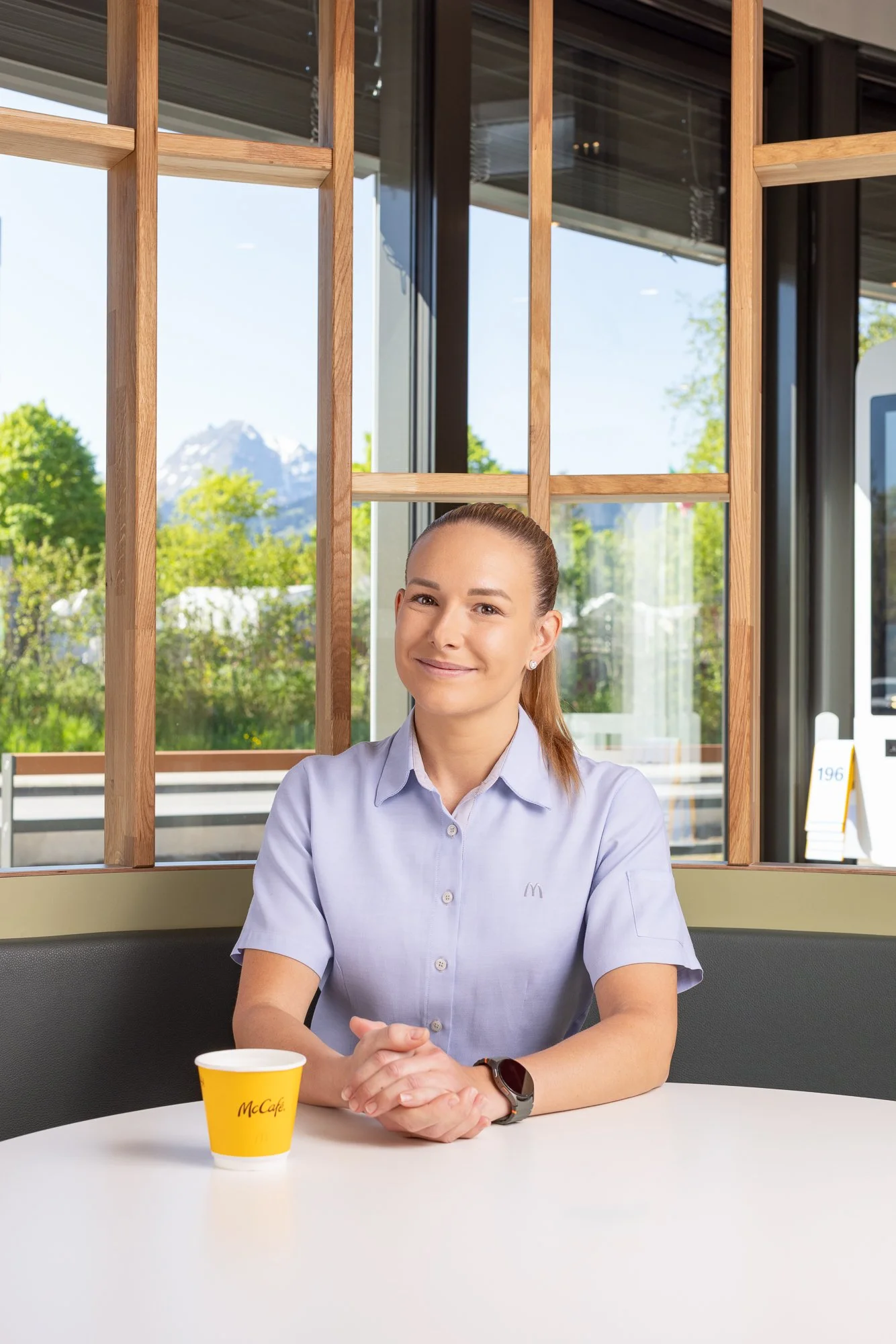 Une femme souriante assise à une table dans un café McCafé, devant une grande fenêtre avec vue sur un paysage naturel avec des montagnes et des arbres.