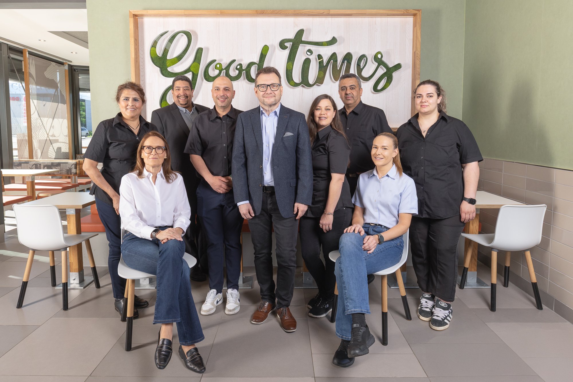 Photo de groupe de neuf personnes posant devant un panneau 'Good Times' dans un restaurant.