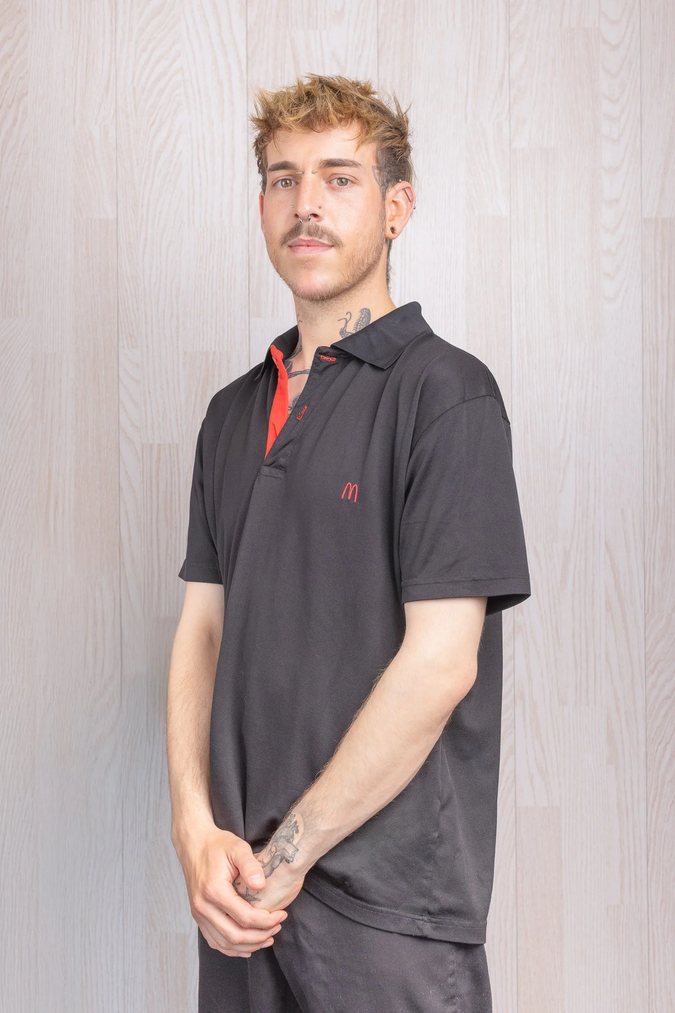Un jeune homme à cheveux blonds et coiffé en désordre, portant un uniforme de travail noir avec un détail rouge et une petite broderie 'M' à gauche, se tenant devant un mur en bois clair.