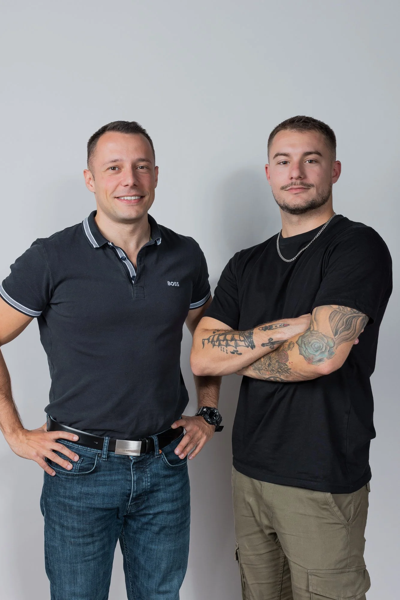 Deux hommes posent côte à côte devant un fond gris, l'un porte une chemise noire et l'autre un t-shirt noir avec des tatouages visibles sur ses bras.