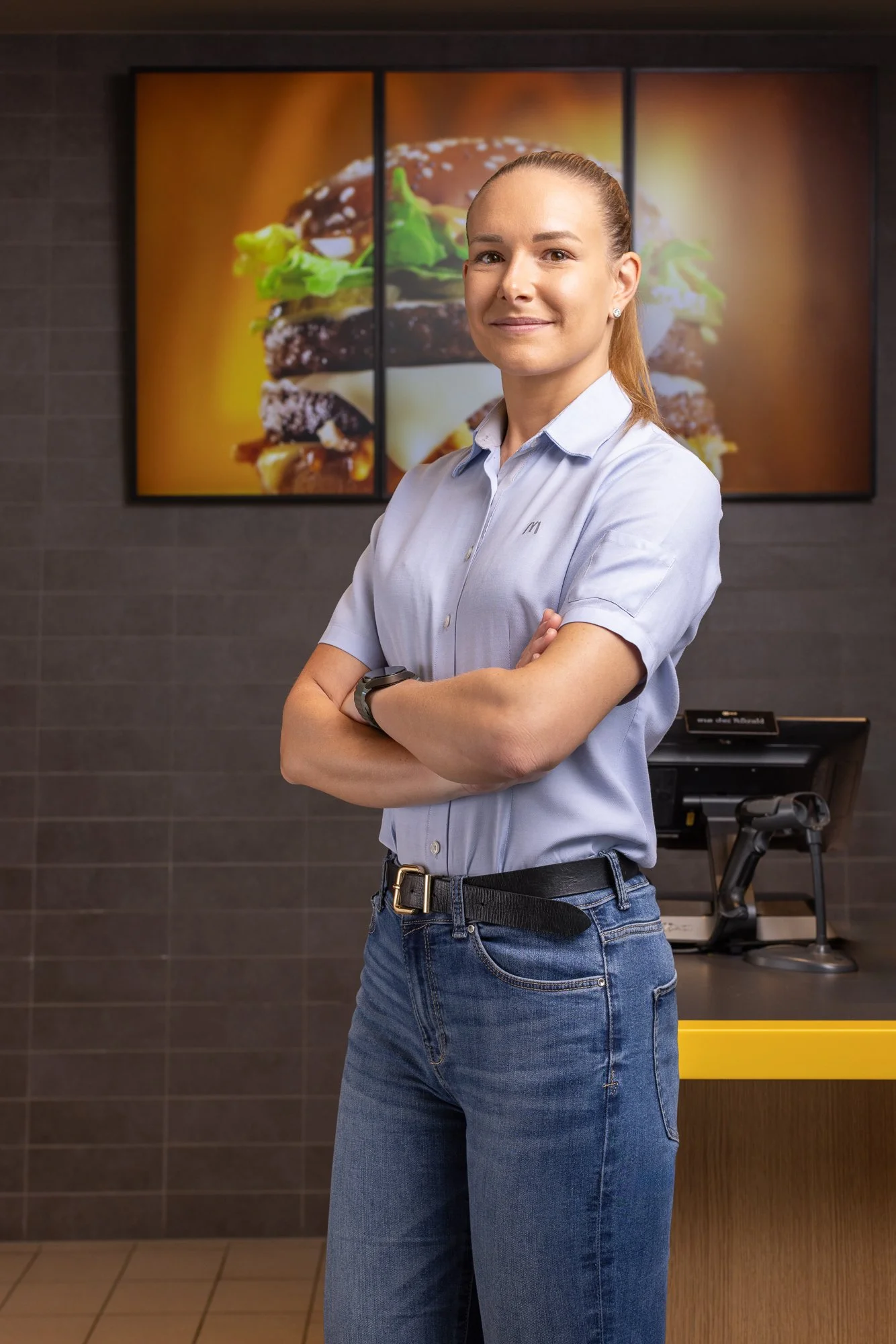 Une femme souriante avec les bras croisés, portant une chemise bleue, en avant d'un panneau McDonald's avec le logo jaune du M et le nom McCafé, en extérieur par une journée ensoleillée.