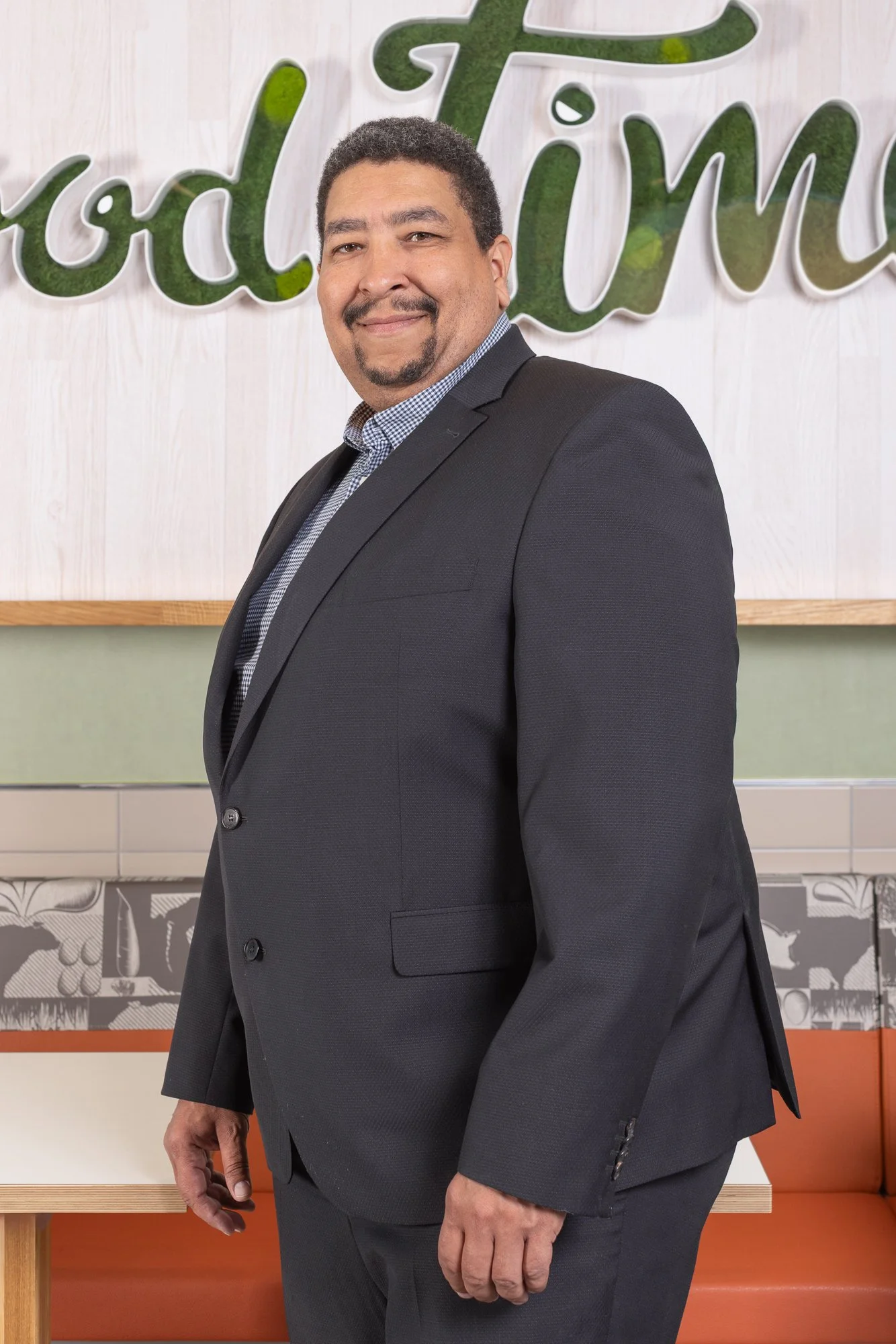 Homme habillé en costume noir debout dans un restaurant ou un café, avec un sourire, devant un panneau décoratif vert et blanc.