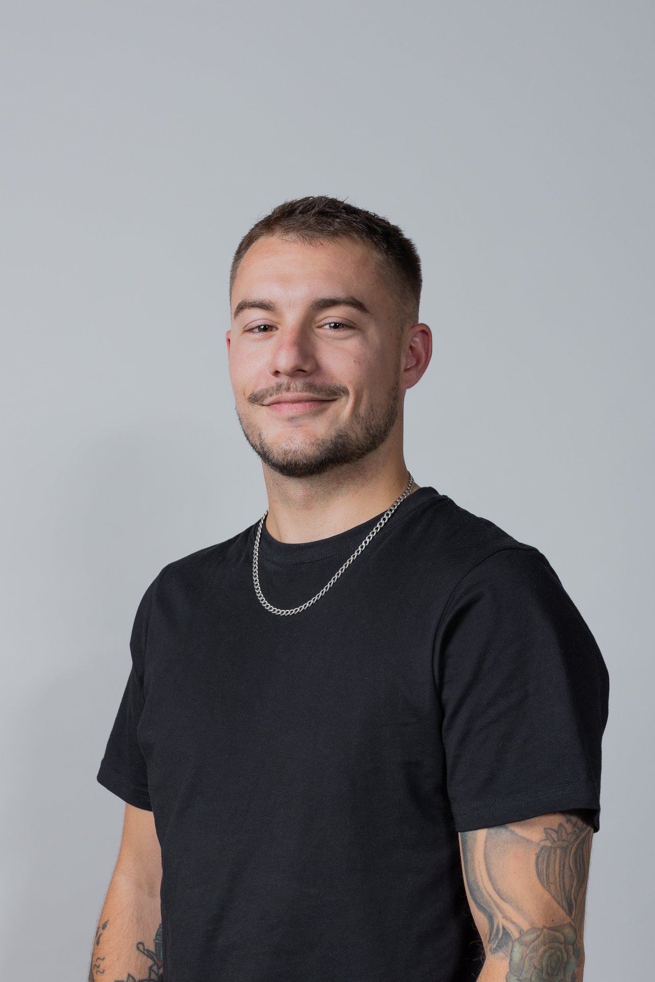 Portrait corporate d'un homme souriant portant un t-shirt noir et une chaîne en argent, avec des tatouages sur le bras, contre un fond gris clair.
