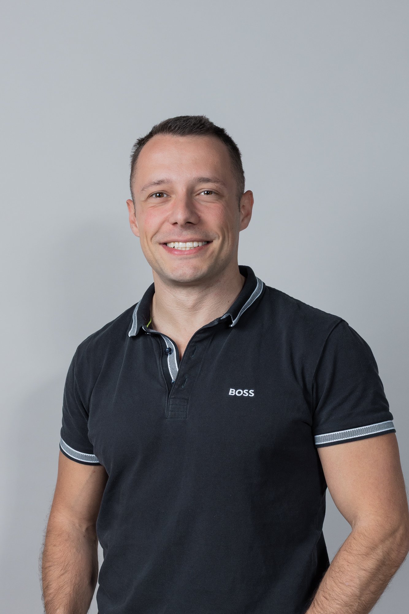 Portrait corporate d'un homme souriant portant un polo noir avec le logo 'BOSS' sur le polo, posé contre un fond gris clair.
