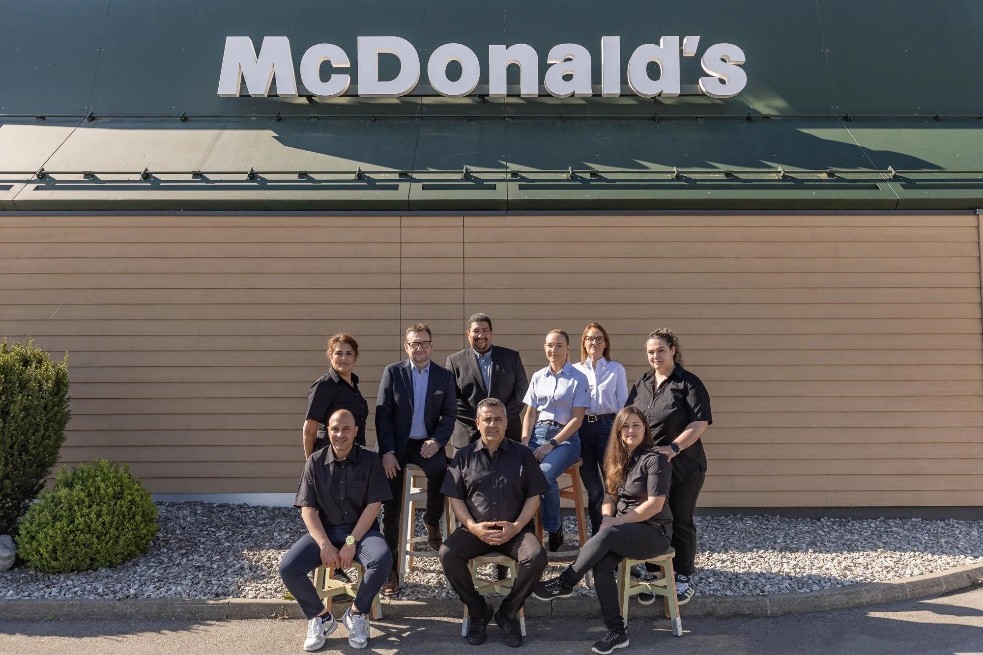 Photo de groupe de huit personnes posant devant un bâtiment de McDonald's.