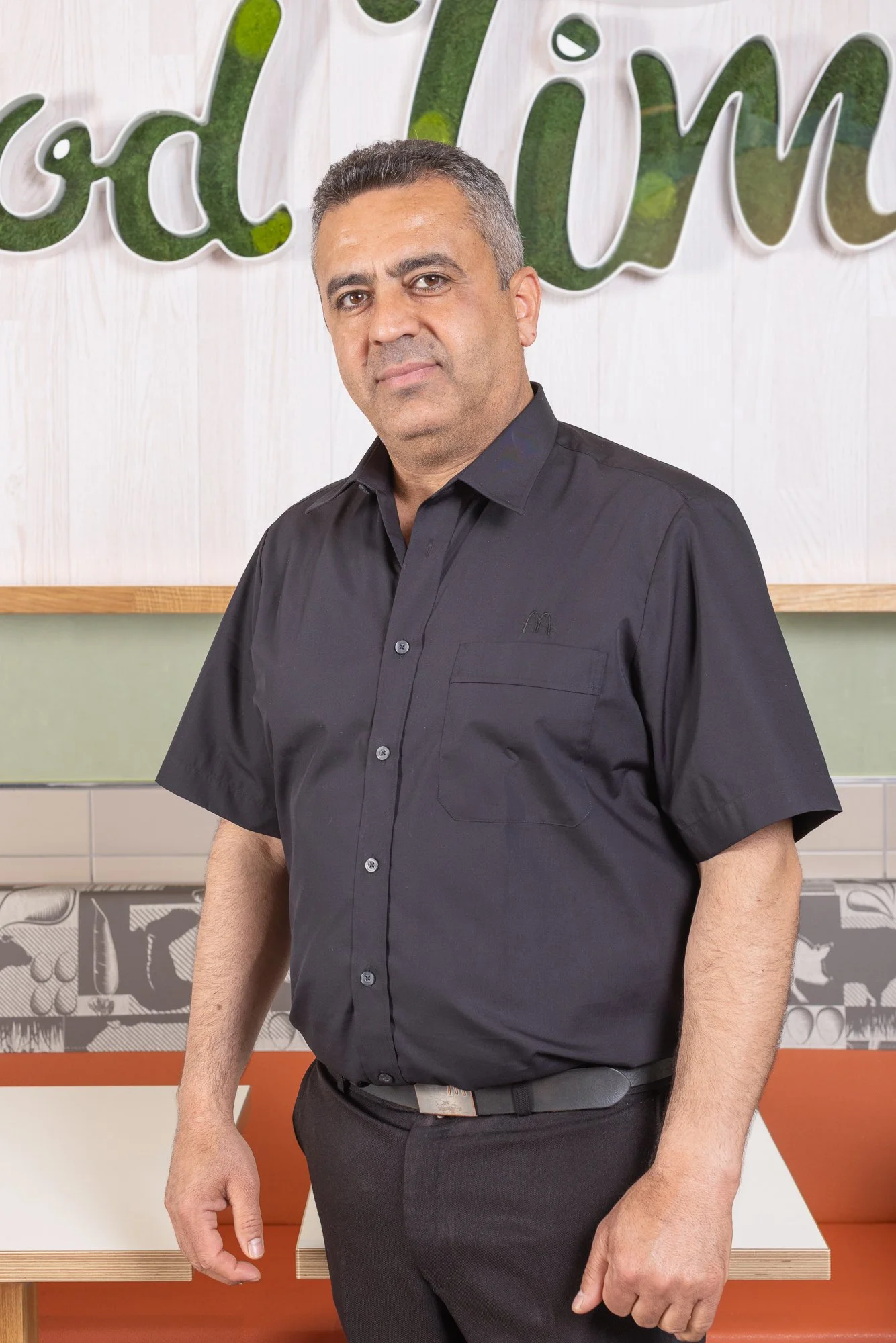 Homme portant une chemise noire dans un restaurant McDonald's devant une écriture murale.