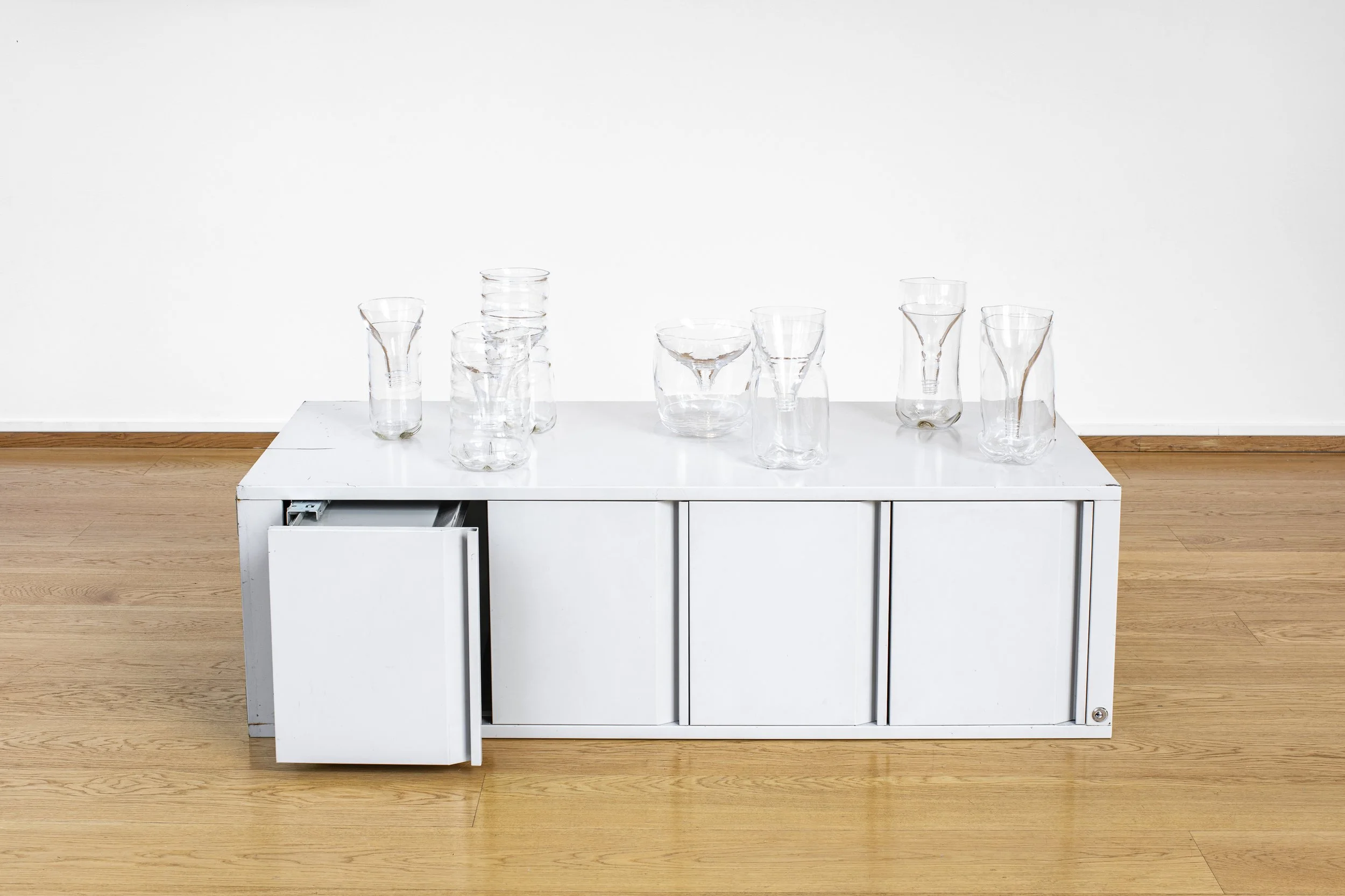 Vase en verre cassé sur une table blanche contre un mur blanc.