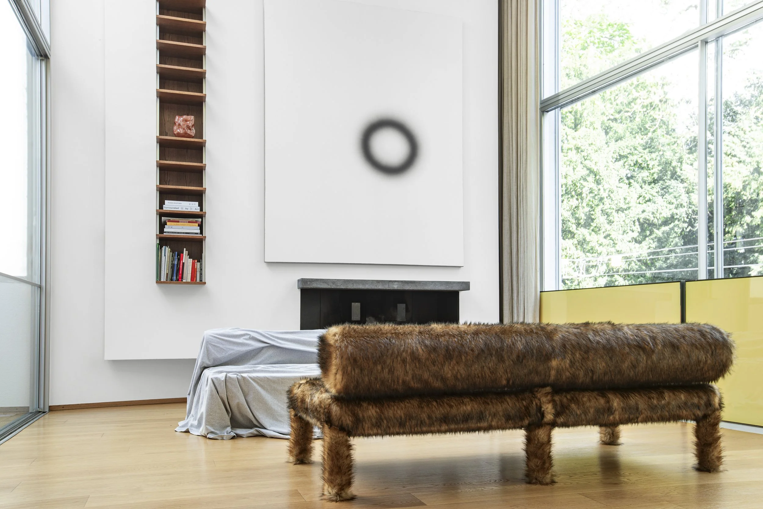 Intérieur moderne avec un banc en fourrure, une cheminée noire, une grande fenêtre laissant entrer la lumière naturelle, une étagère en bois avec des livres et une décoration, un mur blanc avec une œuvre d'art abstraite