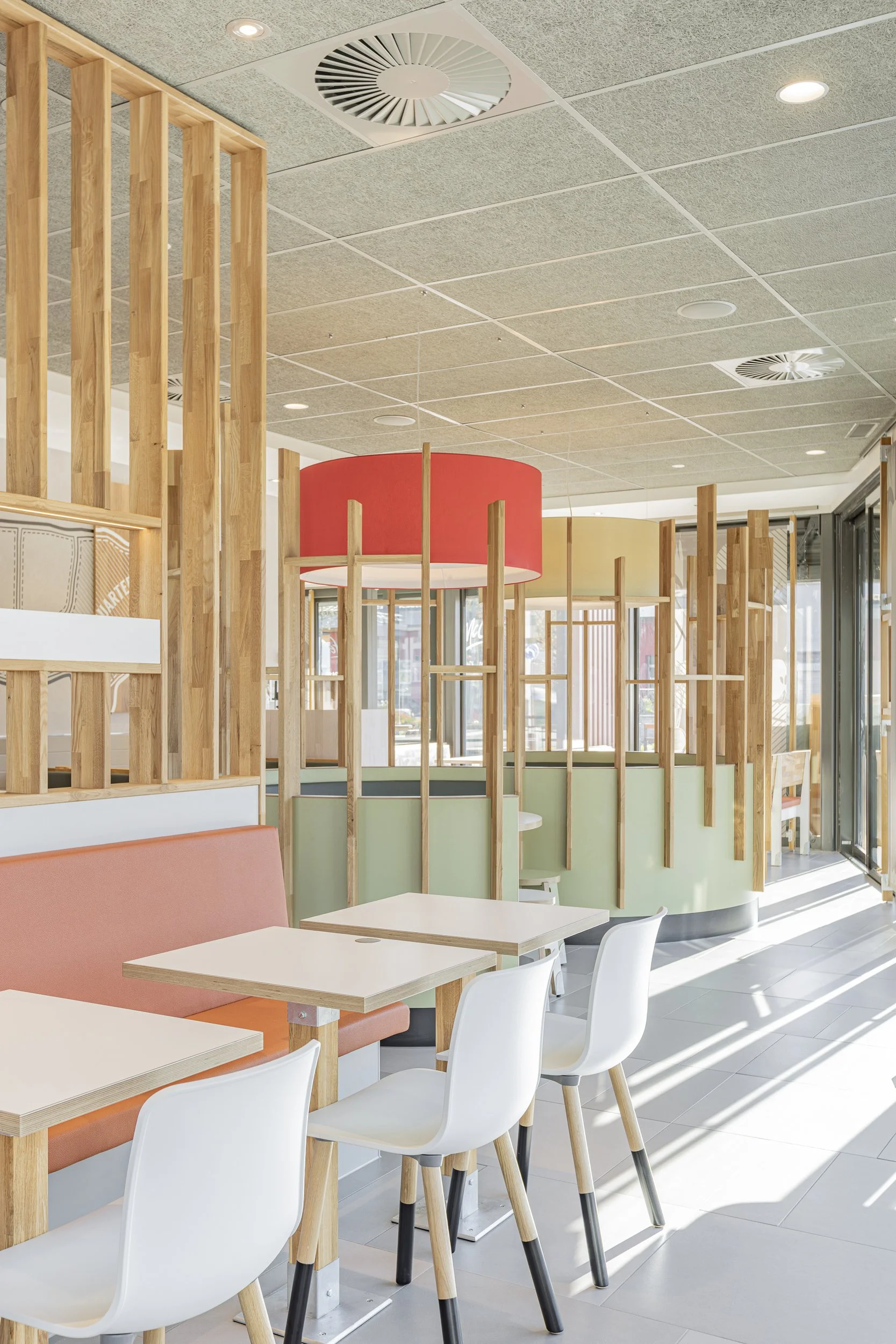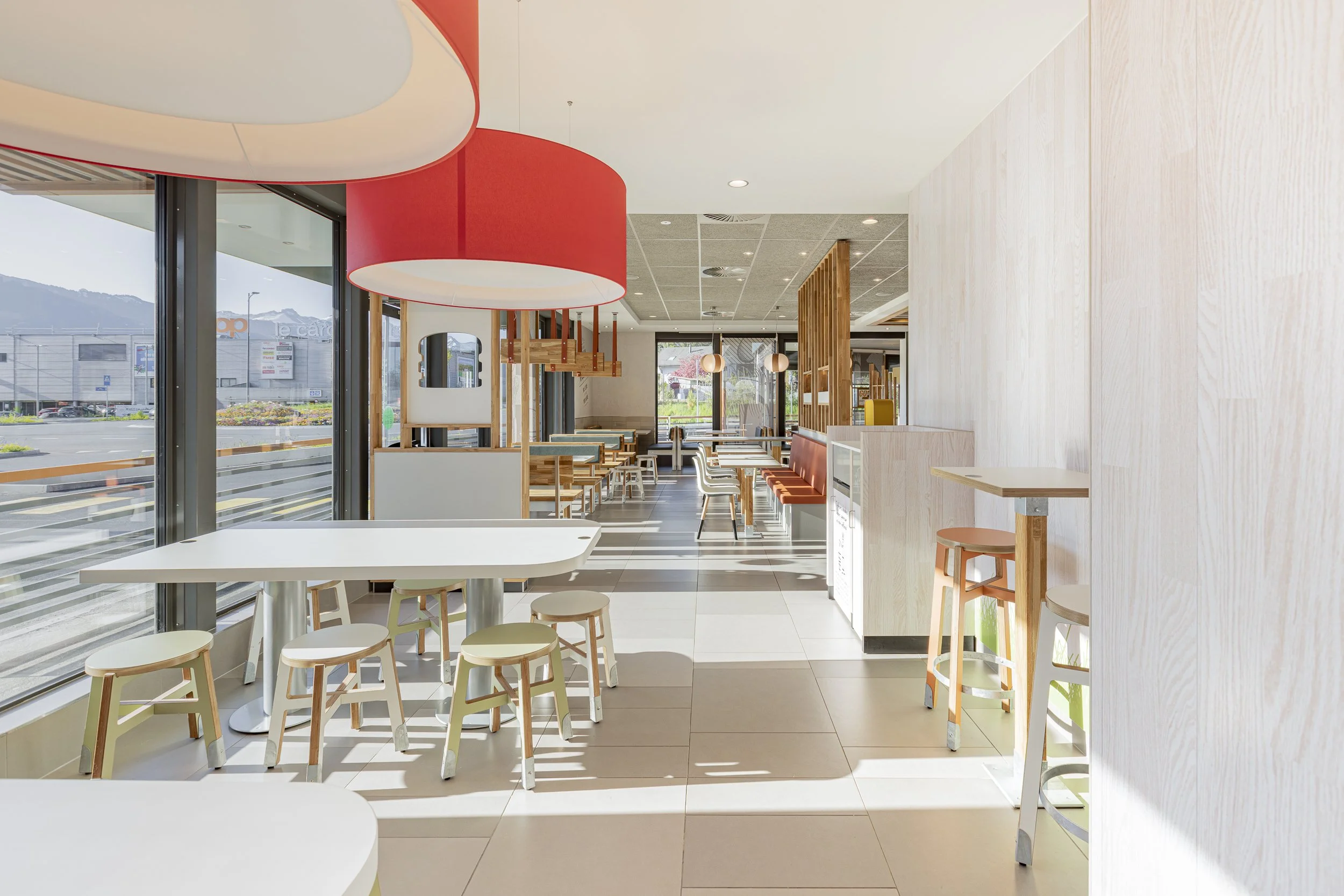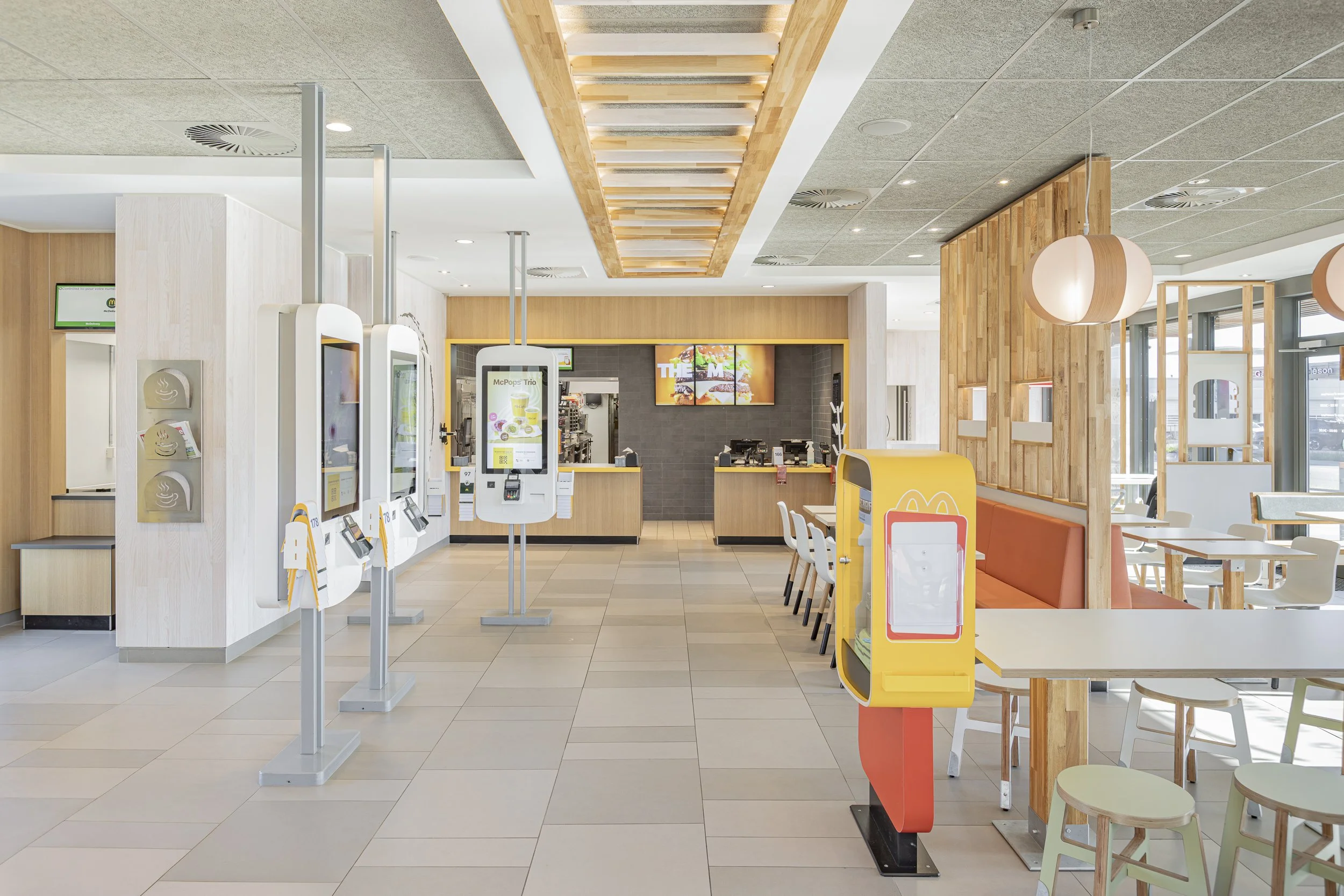 Intérieur d'un restaurant McDonald's avec bornes de commande, comptoir et zones de sièges en bois et blanc.