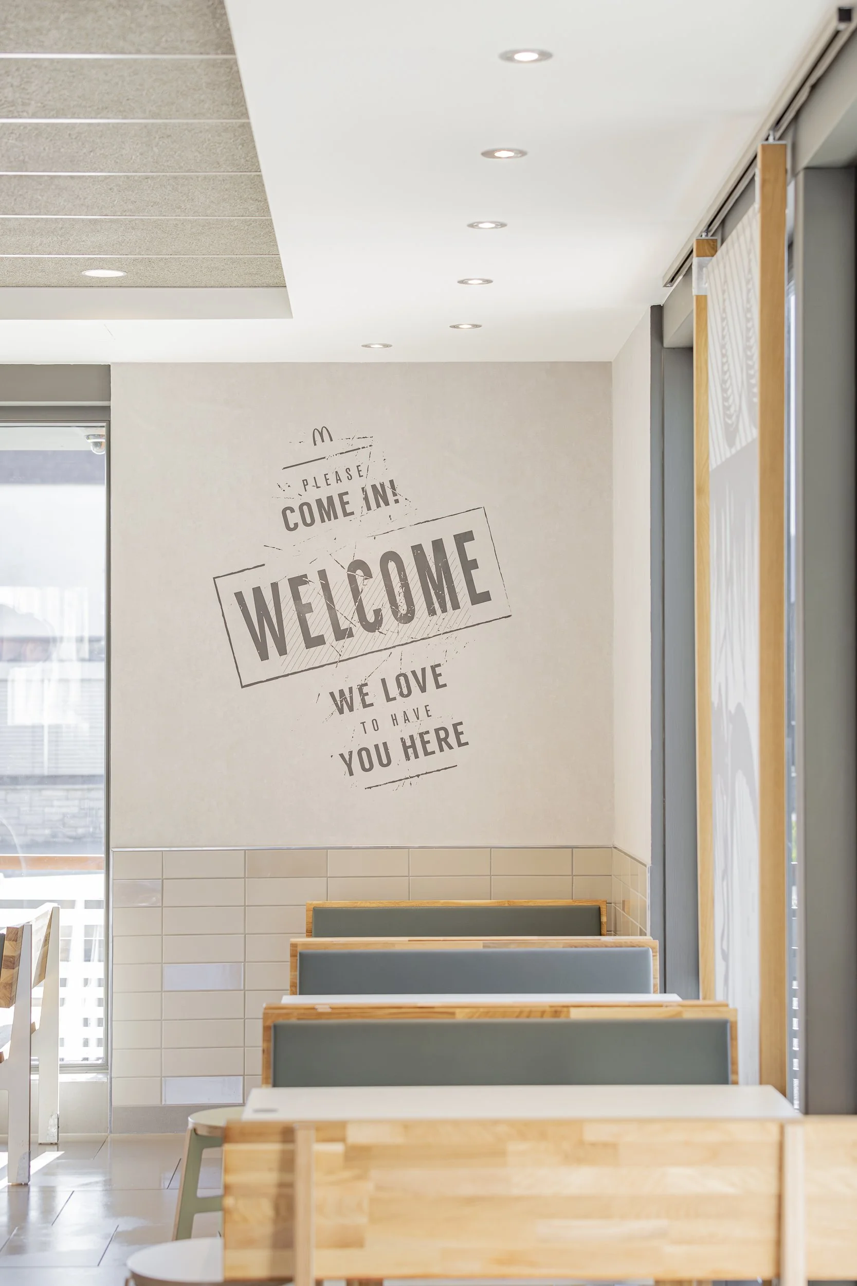 Intérieur d'un restaurant avec une murale annonçant l'accueil et des sièges en bois et tissu vert.