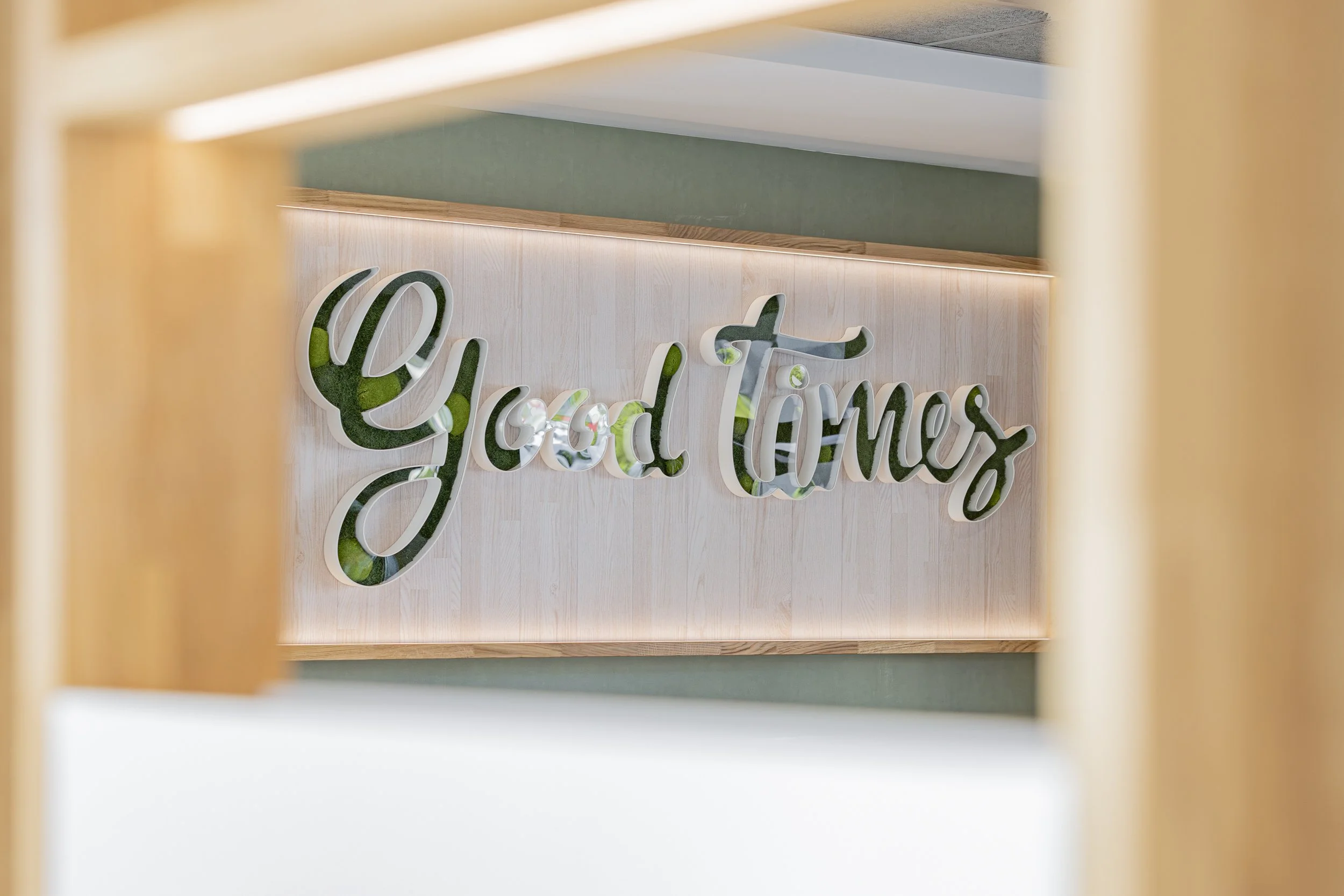 Logo en relief du restaurant 'Good Times' avec un fond en bois clair visible à travers une ouverture en bois.