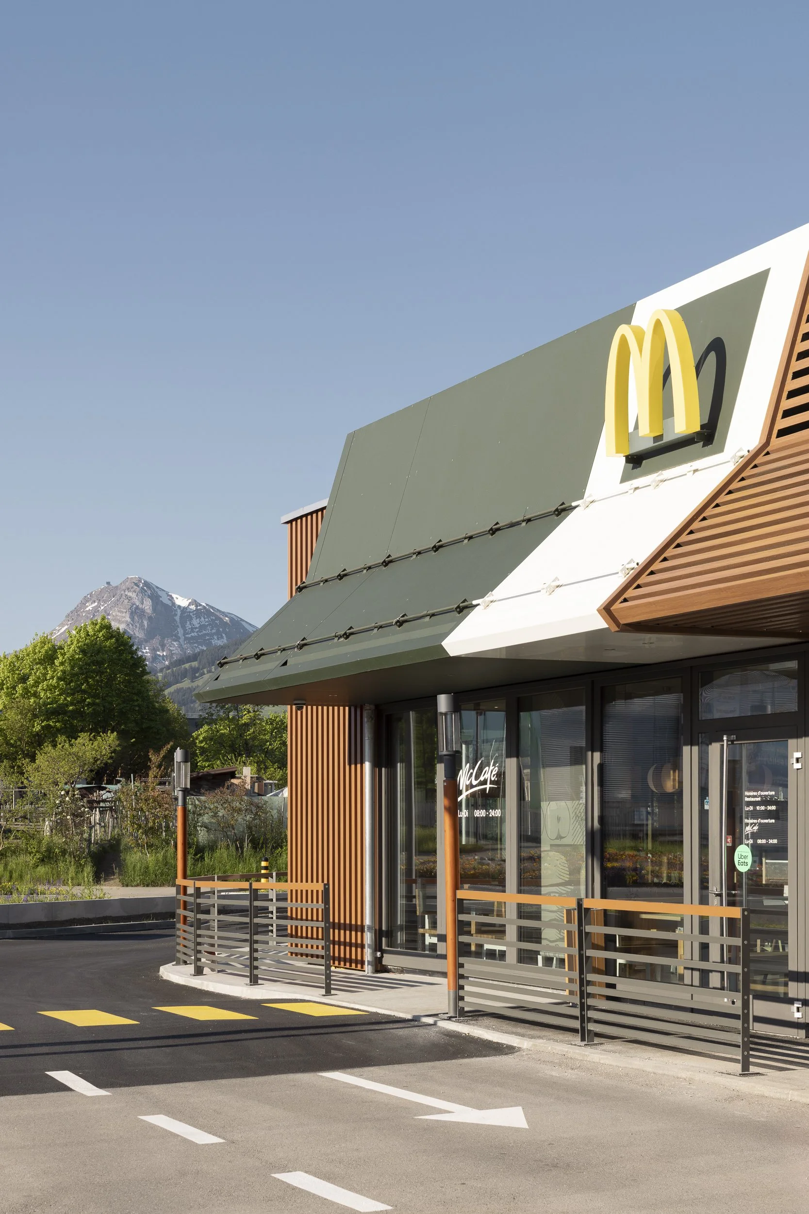 Façade d'un restaurant McDonald's avec le logo en jaune et le nom 'McCafé' en lettres blanches sur un panneau en bois.