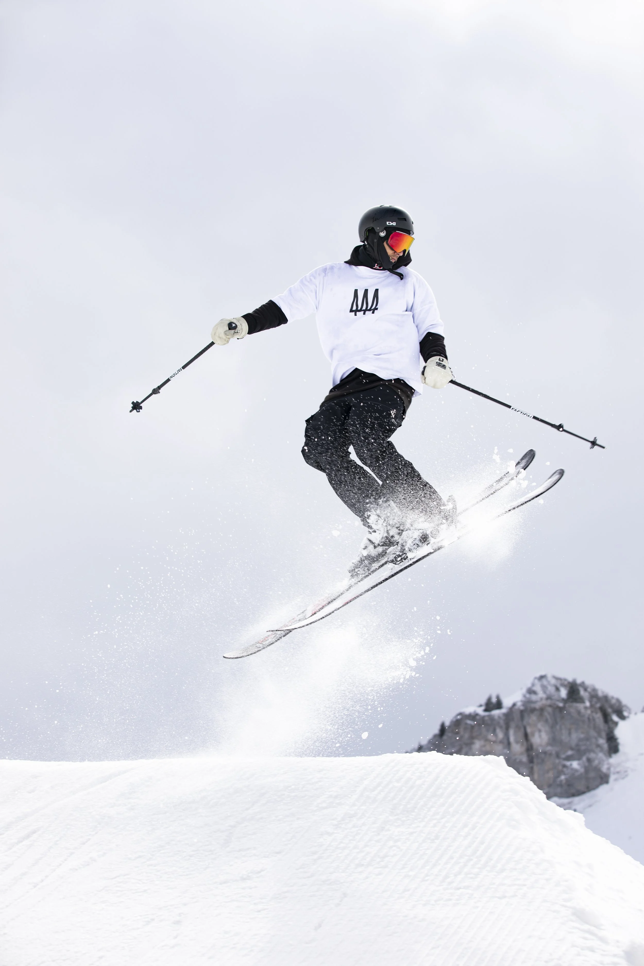 Skieur en l'air effectuant un saut sur un saut de ski enneigée, portant un casque noir, lunettes de ski rouges/oranges, une veste blanche et des gants blancs.