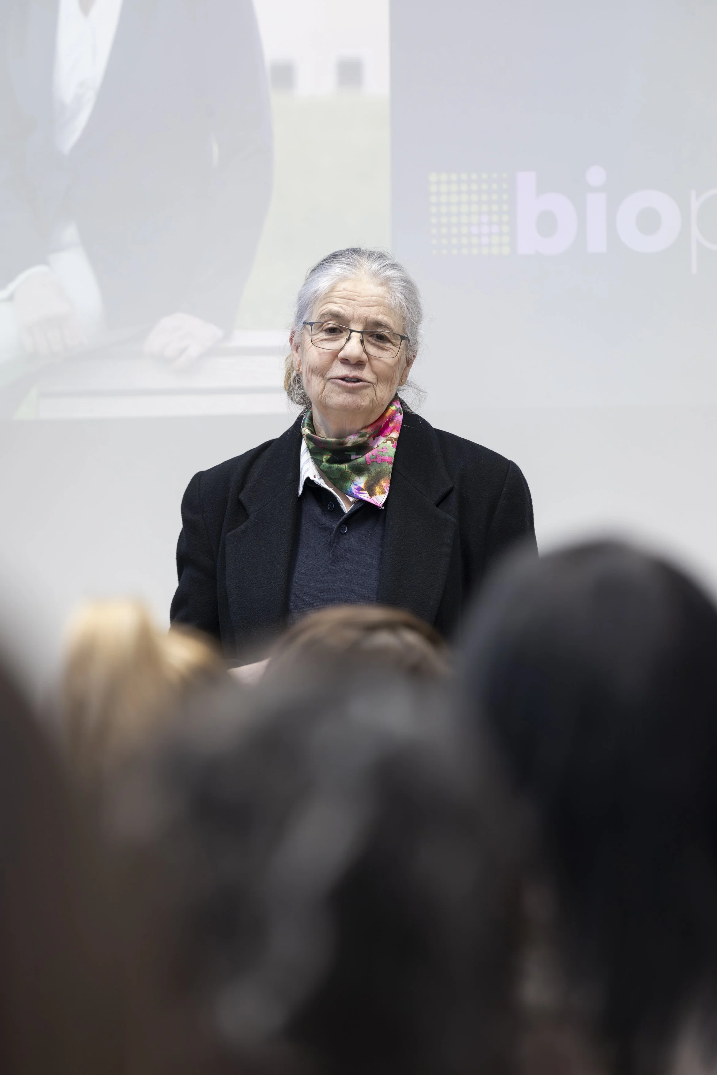 Une femme âgée avec des lunettes parle devant un groupe, portant un manteau noir et un foulard coloré autour du cou, dans une salle avec un écran en arrière-plan.